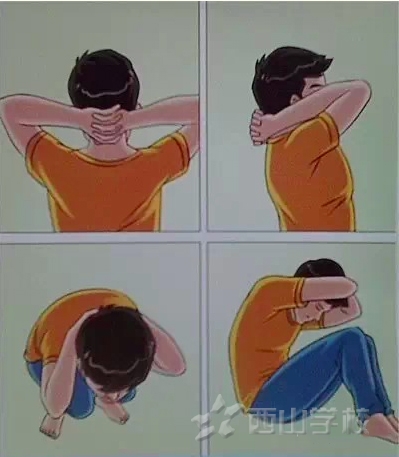 圝圝两手十指交叉相扣、护住后脑和颈部;两肘向前,护住双侧太阳穴。